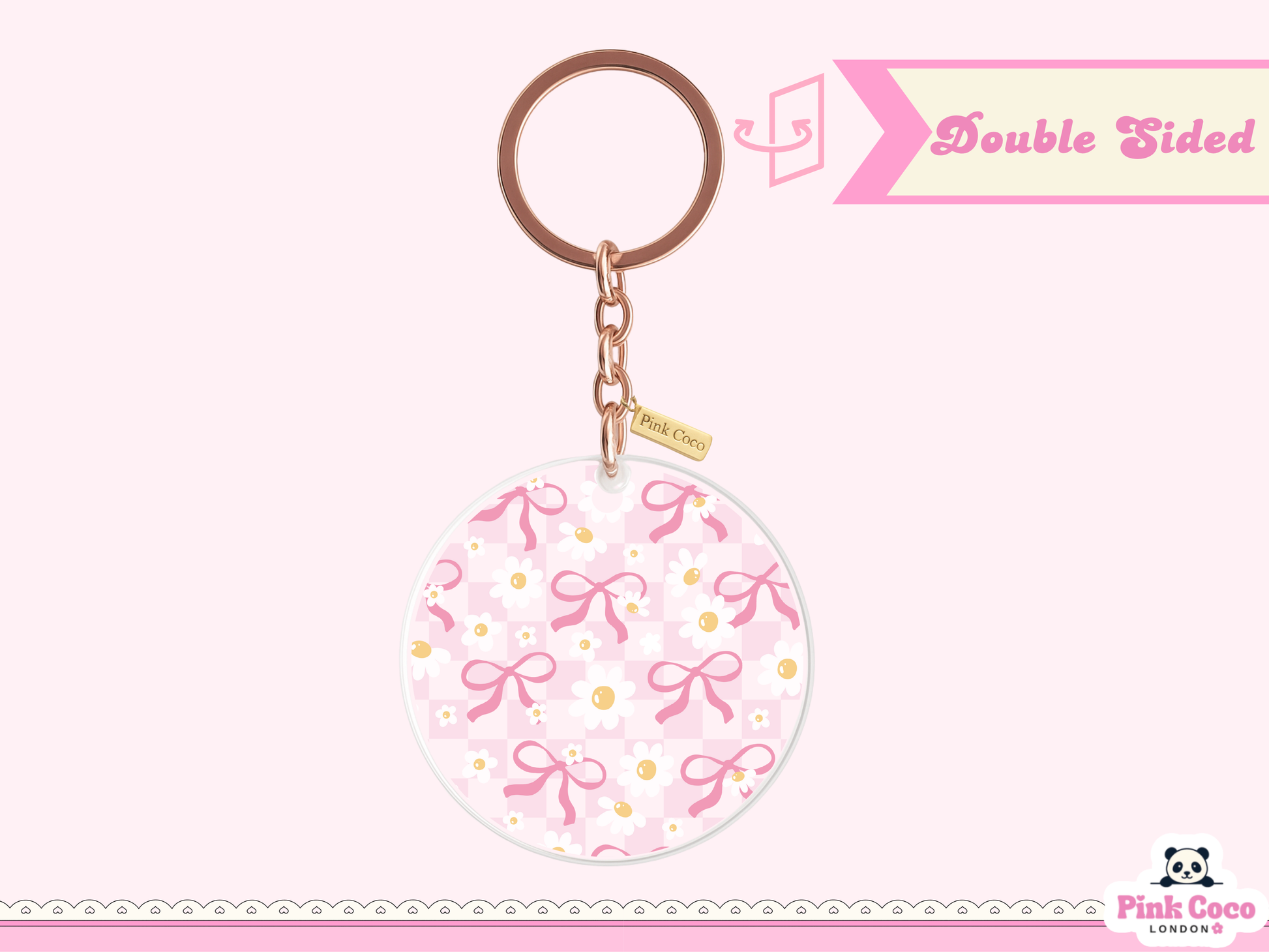 This double sided acrylic keychain is made to add a bright touch to your keys. Each piece has a clear finish with high quality UV DTF artwork on both sides for a smooth and polished look. It also comes with a Pink Coco tag charm that adds a premium feel to the design.